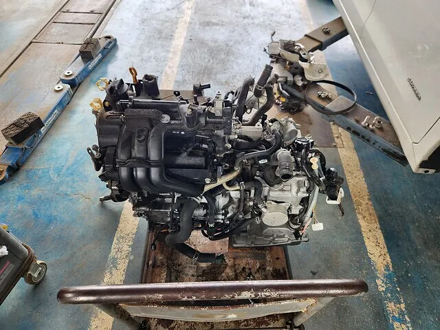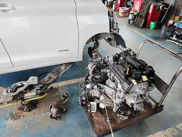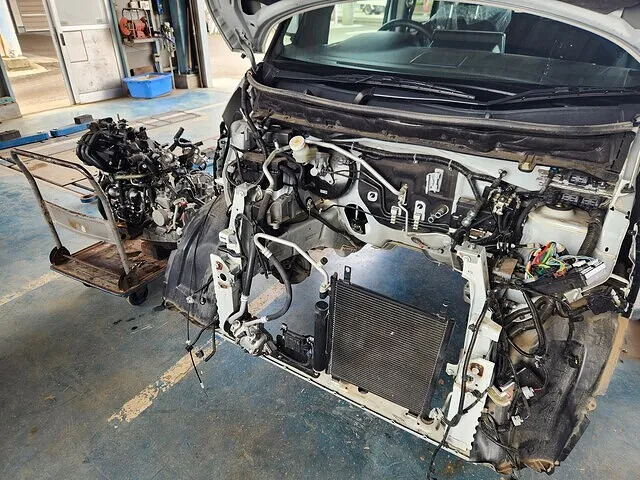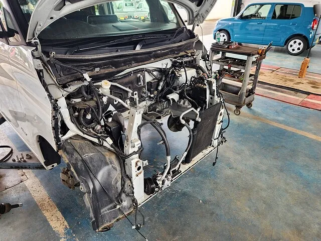 エンジン周りが丁寧に分解されている様子から、スタッフが一台一台しっかり向き合っていることが伝わります。